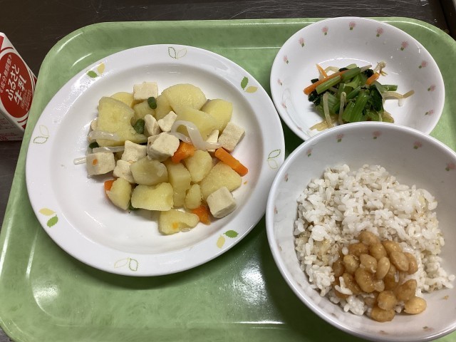 今日の給食は、麦ごはん、大豆とじゃこの甘辛あげ、塩とりじゃが、小松菜のおひたし、牛乳です。