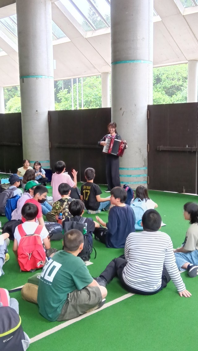 食堂の準備が整うまでの待ち時間に、音楽の野村先生がアコーディオンを演奏してくれました。演奏に合わせて自然と合唱が始まりまました。子ども達のきれいな歌声が響いています。