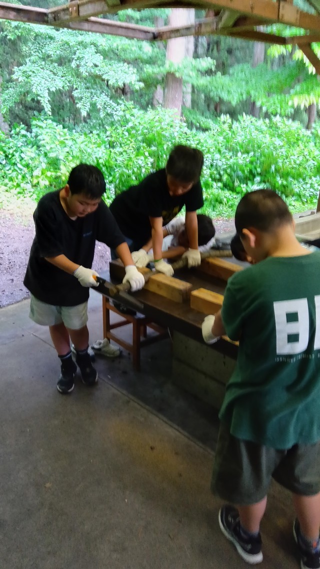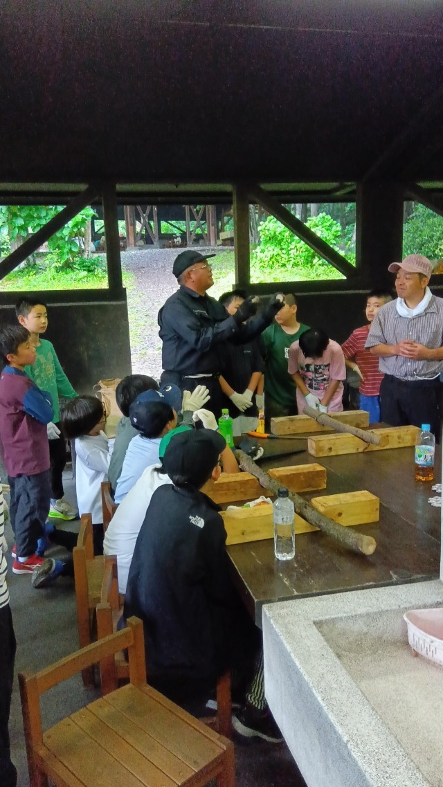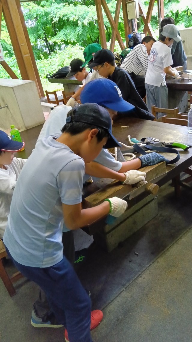 座学の後は、作業場に移動しての体験活動です。ノコギリでコナラの木を切ってストラップ作りをします。木を押さえる人と切る人とで協力しながら活動をしていました。