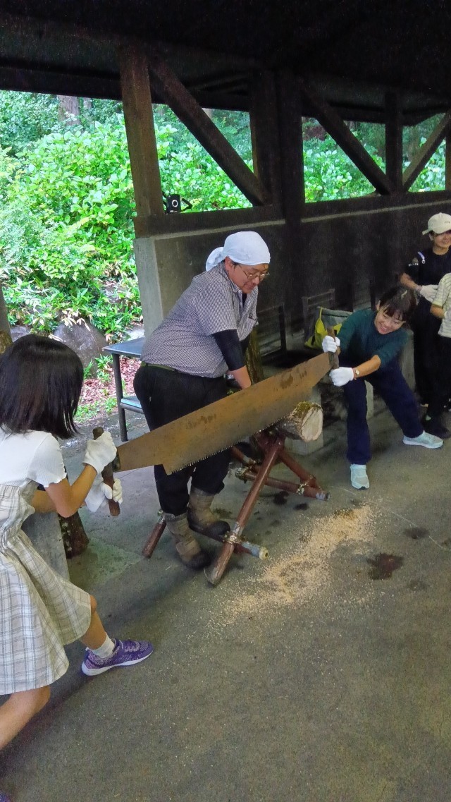 もう一つの林業体験は、二人一組になっての丸太切りです。2人で息を合わせて、ギコギコ切ります。