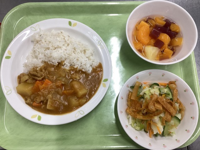 今日の給食は、カレーライス、パリパリサラダ、ブドウゼリー入りフルーツポンチ、牛乳です。