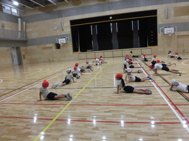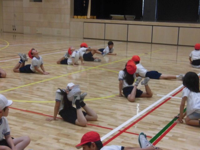 2年生の体育の様子です。体の柔らかさを高める運動につながる運動遊びをしています。