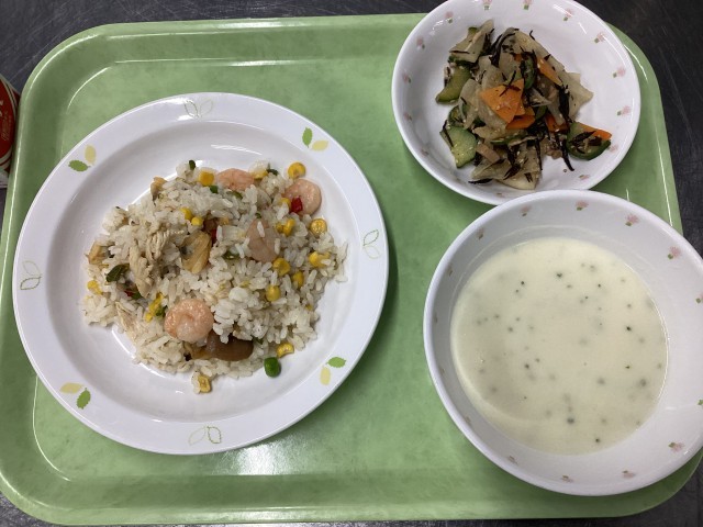 今日の給食は、ホワイトピラフ、ポテトポタージュ、大根とひじきのサラダ、牛乳です。