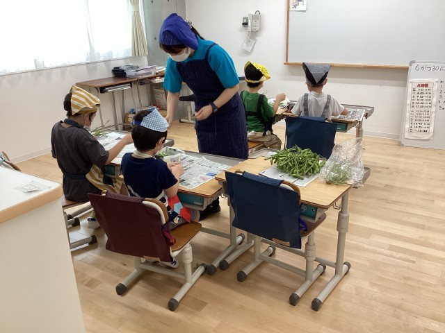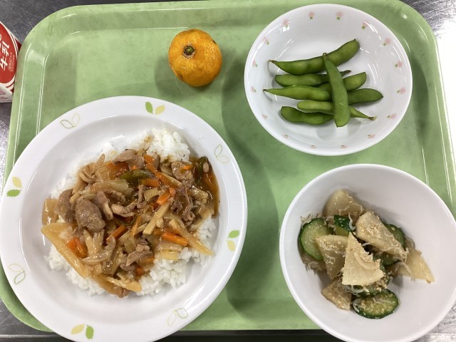 今日の給食は、スタミナ丼、じゃこと大根のサラダ、枝豆、冷凍みかん、牛乳です。今日はにじいろ学級で枝豆のさやとりを行いました。