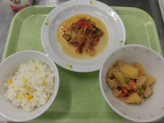 今日の給食は、とうもろこしご飯、魚の甘酢あんかけ、鶏肉とじゃが芋の煮物、牛乳です。