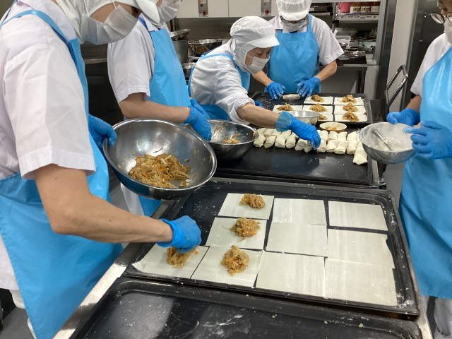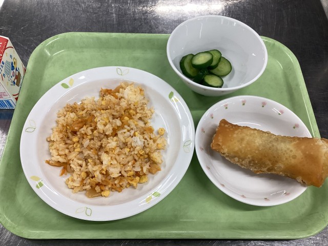 今日の給食は、キムチチャーハン、春巻き、きゅうりのひとしお、牛乳です。先日、給食中の放送で、「給食室で作るのが大変なメニューは何でしょう?」というクイズがありました。答えは、春巻きとコロッケです。今日は、たくさんの児童から「作るの大変だった?」「美味しかったよ」という感想をいただきました。