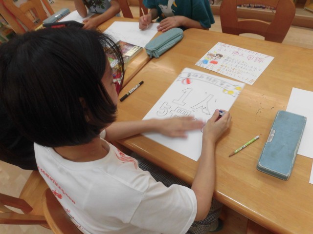 図書委員会は、夏休みの本の貸し出しに関するポスター作りをしていました。