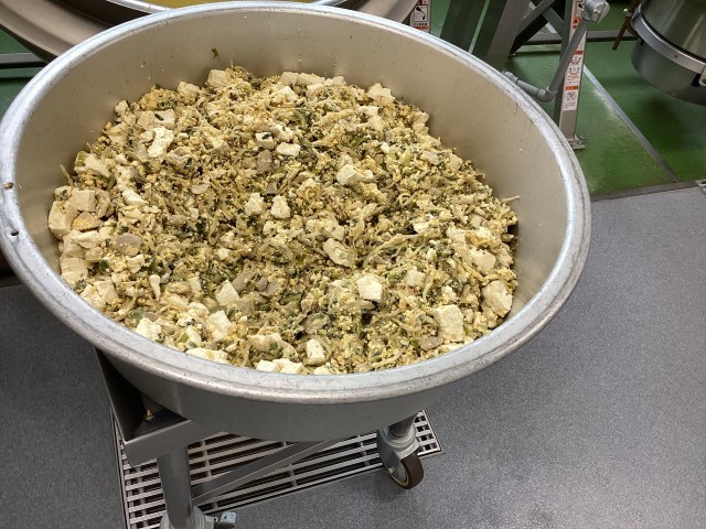 今日の給食は麦ご飯、照り焼きチキン、ゴーヤチャンプル、玉ねぎと油揚げのみそ汁、牛乳です。