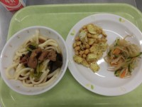 今日の給食は、あまから肉うどん、青のりポテトビーンズ、もやしの胡麻酢和えです。