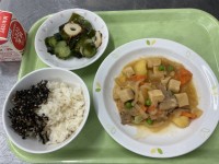 今日の給食は、七分つきごはん、あさりとひじきのふりかけ、肉じゃがうま煮、きゅうり...