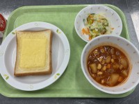 今日の給食は、チーズトースト、ポークビーンズ、コールスローサラダ、牛乳です。