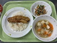 今日の給食は、さんま(北海道産)のかば焼き丼、野菜の梅おかか和え、豆腐汁、牛乳で...