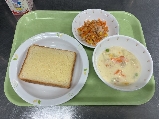 今日の給食は「シュガーバタートースト、コーンシチュー、にんじんサラダ」です。