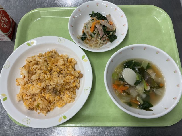 今日の給食は、キムチチャーハン、トック入りスープ、ナムル、牛乳です。