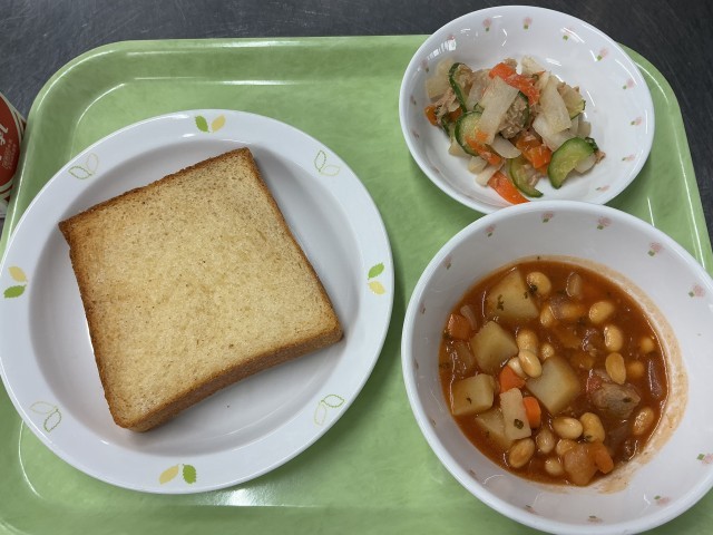 今日の給食は、胚芽パンのシュガーバタートースト、ポークビーンズ、ツナと大根のサラ...