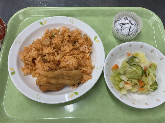 今日の給食は、ケチャップライス、フライドチキン、フレンチサラダ、ブラウニー、牛乳...