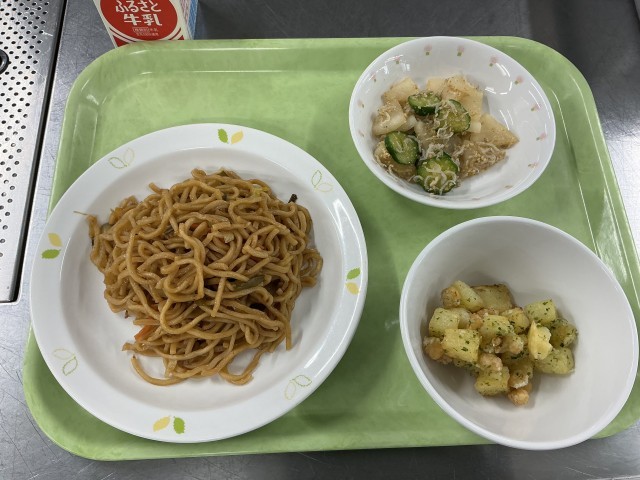 今日は「ソース焼きそば、青のりポテトビーンズ、じゃこと大根の和え物」です。昨日か...