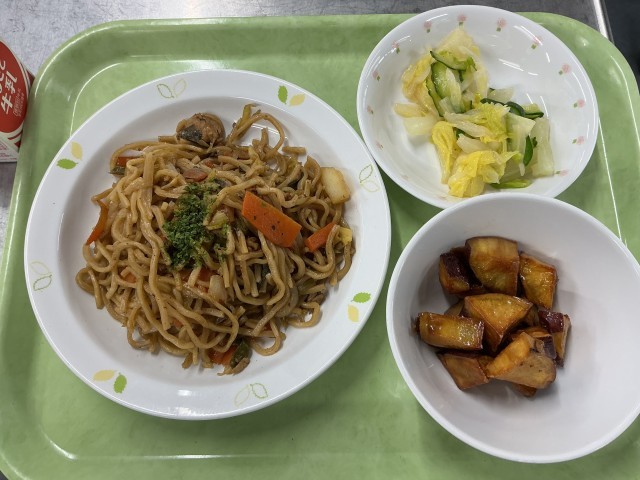 今日の給食は、ソース焼きそば、辣白菜、大学いも、牛乳です。