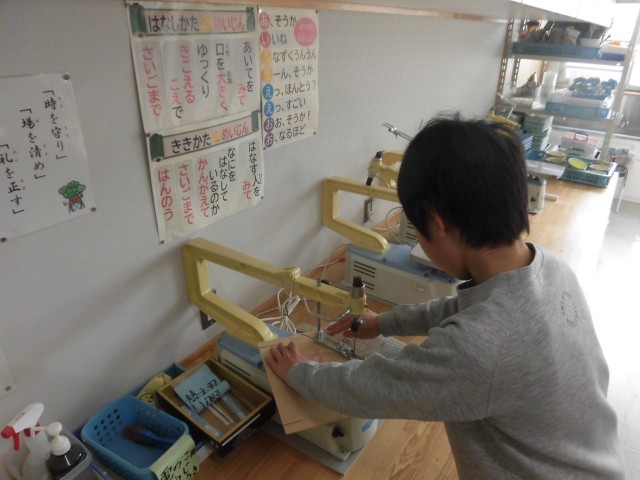 5年生の図工の様子です。ティッシュボックスづくりに励んでいます。電動糸のこで背面...