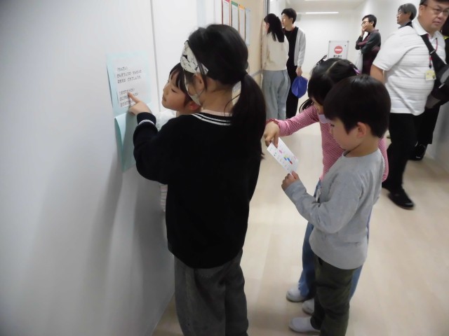 1・2年生が合同で学校たんけんをしています。校内に貼られている学校に関するクイズ...