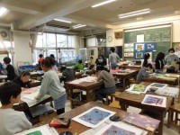 5年生の授業は図工です。版画の授業です。彫刻刀で彫っている人、電動のこぎりで木を...