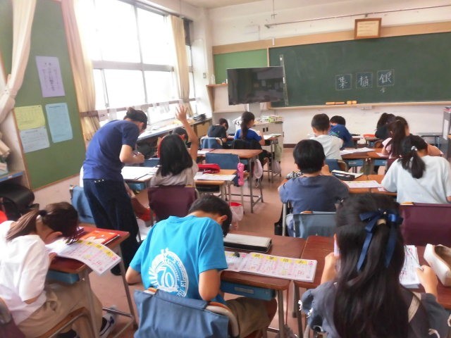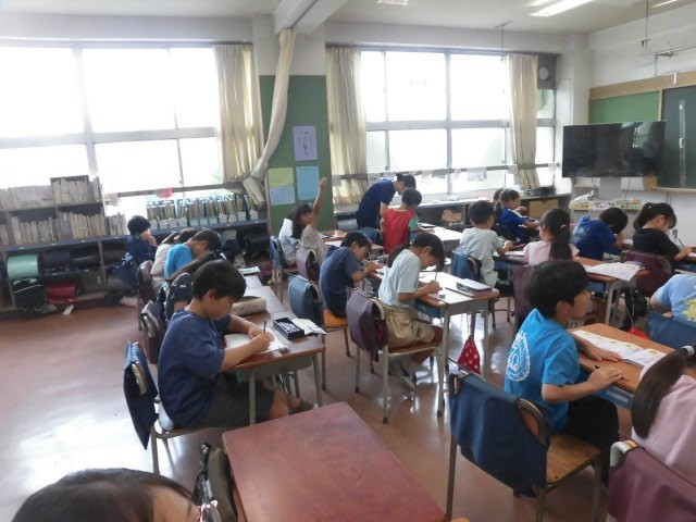 子どもたちは一人ひとり静かに漢字の練習をしています。先生が子どもたちの机をまわり、様子を見ています。