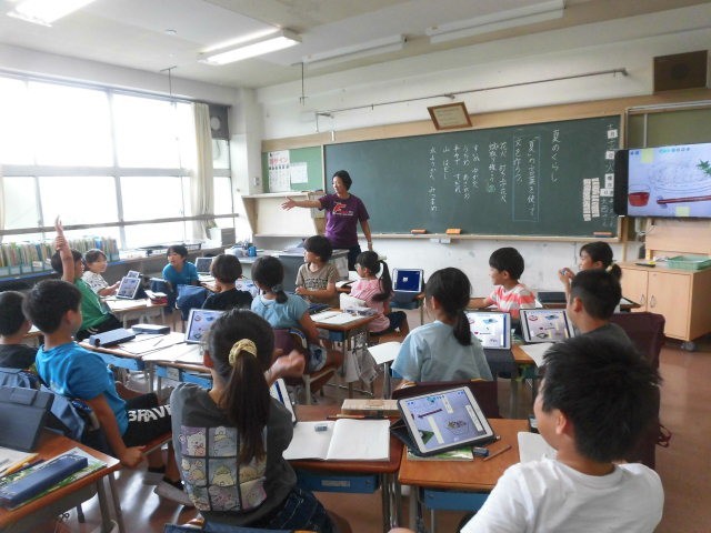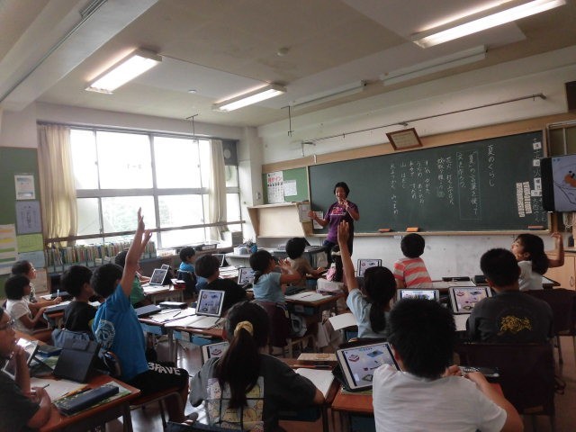3年生の教室では国語の授業をしていました。夏のくらしと題して、夏の生活の中で出てくるものについて、みんなで話をしていました。教室の中がとても盛り上がっています。