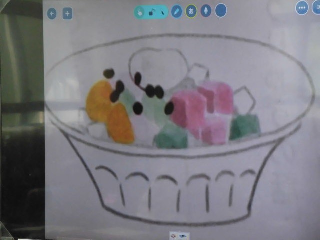 教室に入っていすぐ、「校長先生、これは何の絵か分かりますか。」と、聞かれました。わたしは、おもいきり「あんみつです。」と、答えました。しかし、違うそうです。これは、「みつまめ」だそうです。子どもたちは、考えます。「何が違うのだろう。」一人の人が気付きました。「あんこのある、無しで決まります。」その通りだそうです。大正解です。とても勉強になりました。3年生に教えてもらいました。そのほか、いろいろな夏の暮らしに関するものの名前が挙がっていました。