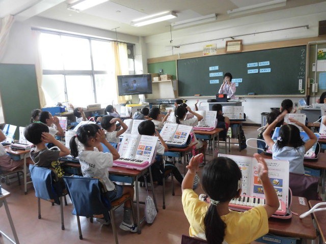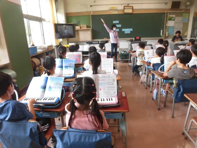 1年生の授業は音楽です。鍵盤ハーモニカの学習です。
