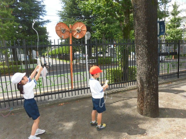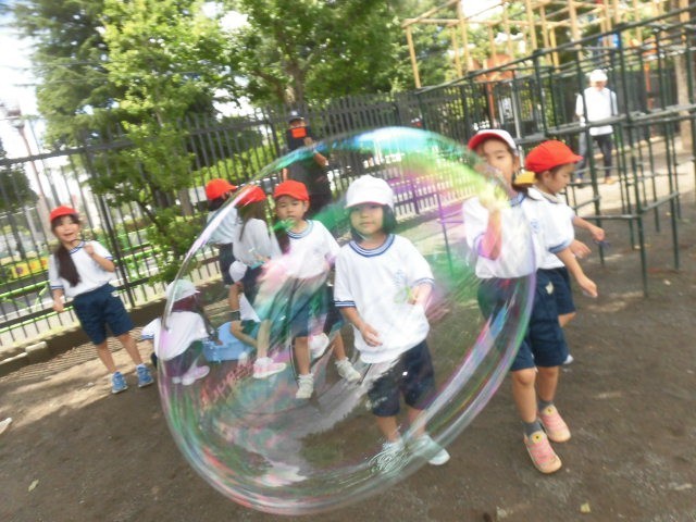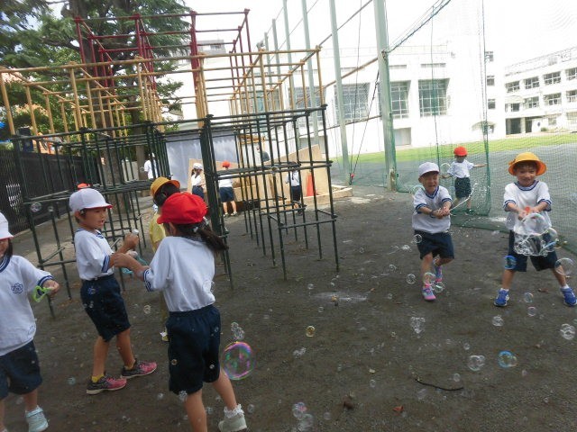 家から持ってきたいろいろな容器に水を入れて水鉄砲のようにとばしたり、シャボン玉をとばしたりしています。飛んでいるシャボン玉を水でねらっている人もいます。子どもたちはいろいろな遊びを考えています。とても楽しそうです。