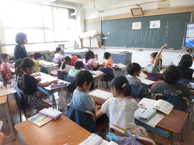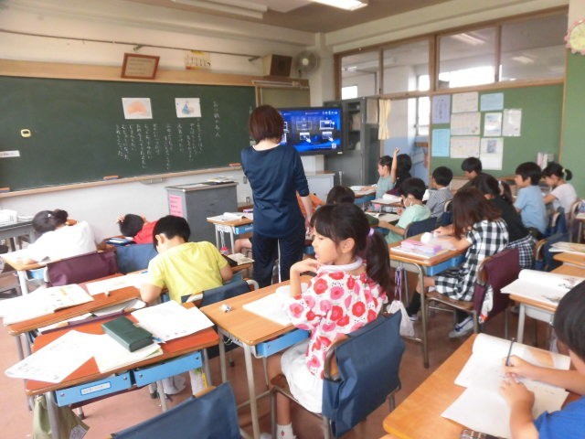 2年生の授業は道徳です。子どもたちは一人ひとりワークシートを記入しています。先生が子どもたちの記入の様子を見ています。