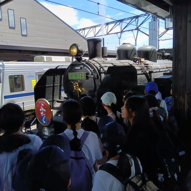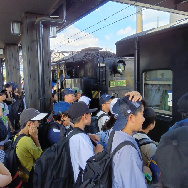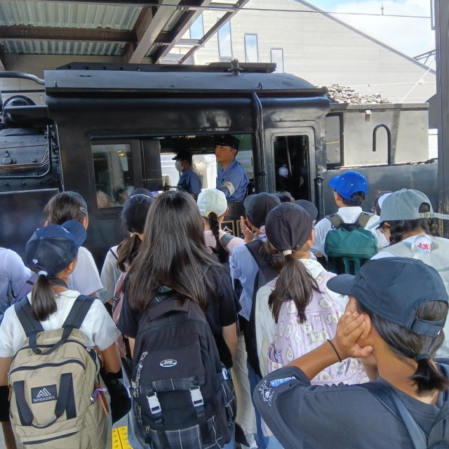 さあ、乗車てす。本物のSLを近くで見て、喜ぶ子どもたちです。