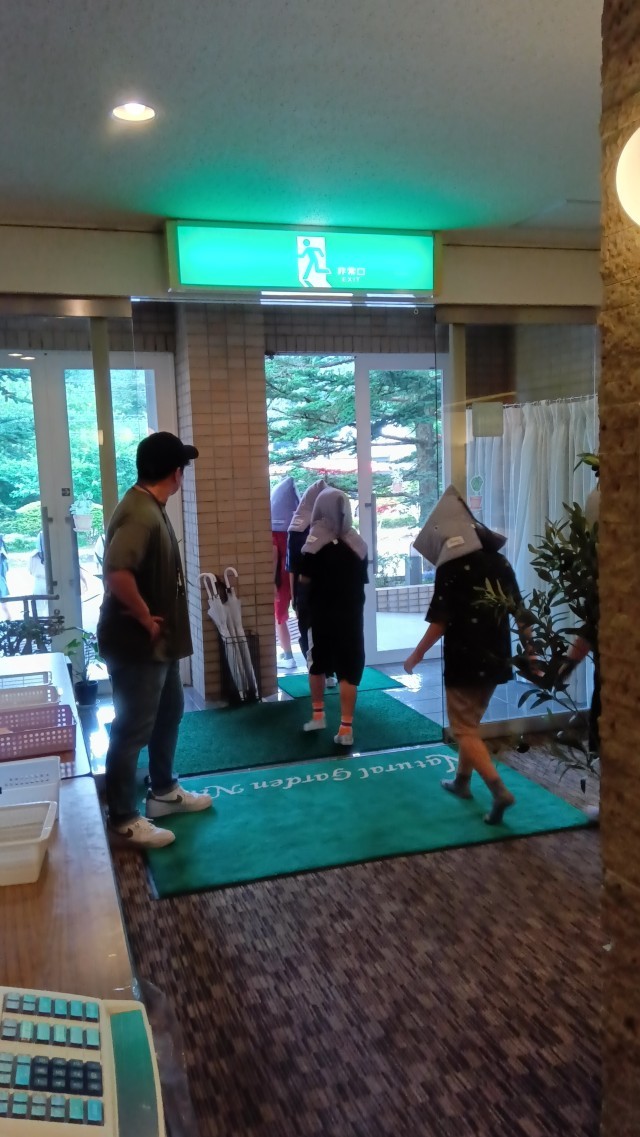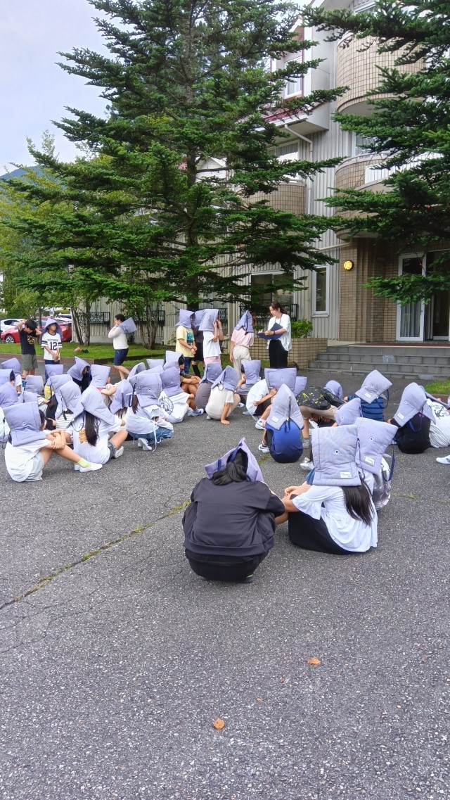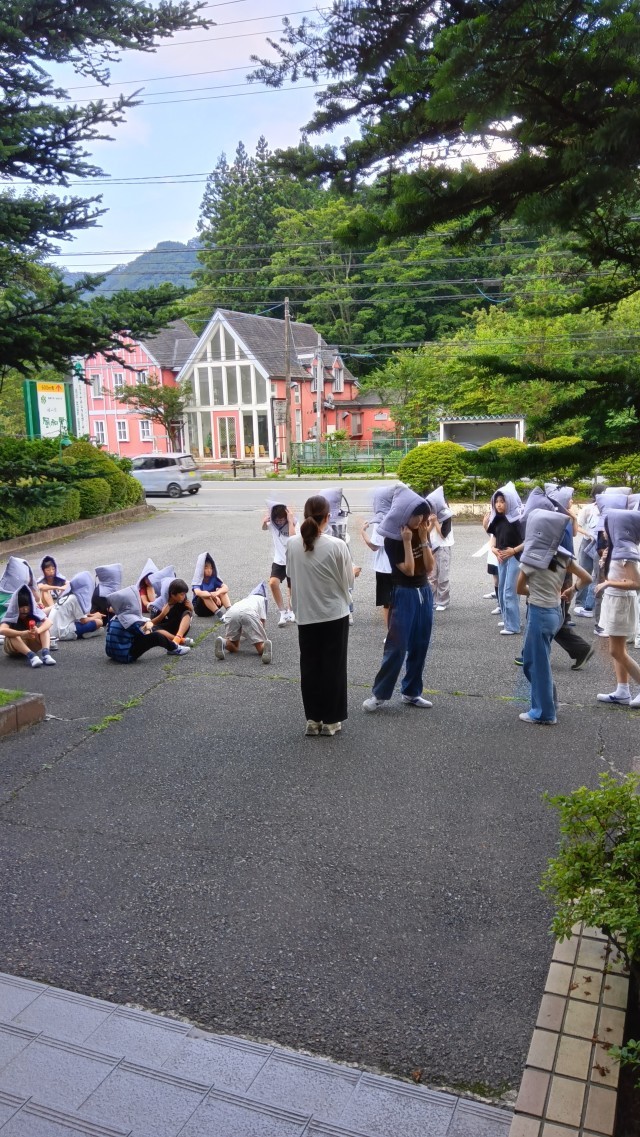 一度入室したあと、すぐに避難訓練を行いました。各部屋にある防災頭巾をかぶって、外に避難しました。