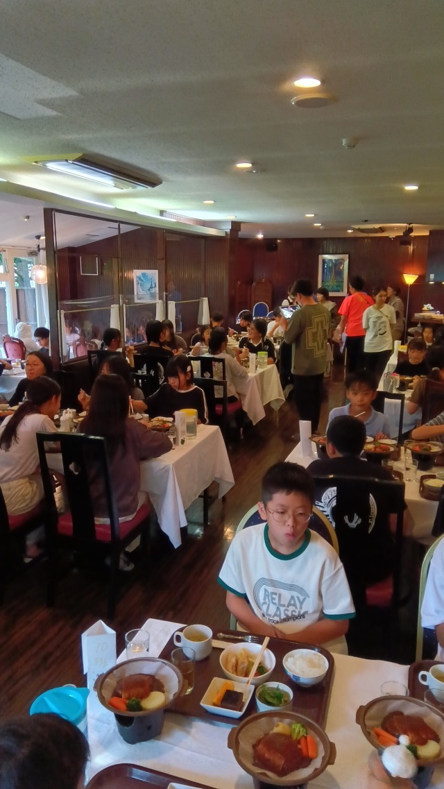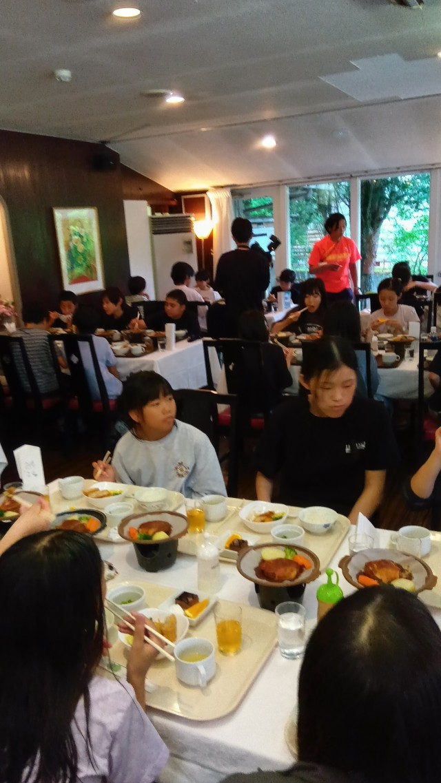 日光最後の夕食です。何杯もご飯をおかわりしている人がいます。ものすごい食欲です。たくさん歩いたので、おなかが減ったのでしょう。みんな笑顔でごはんを食べています。