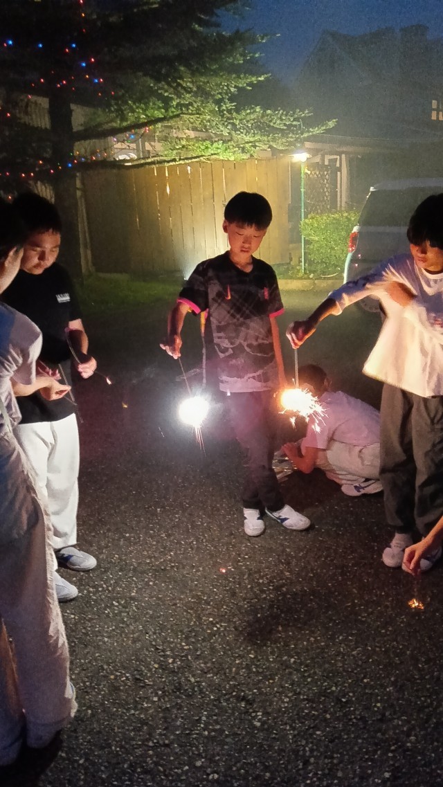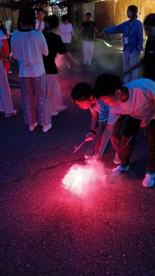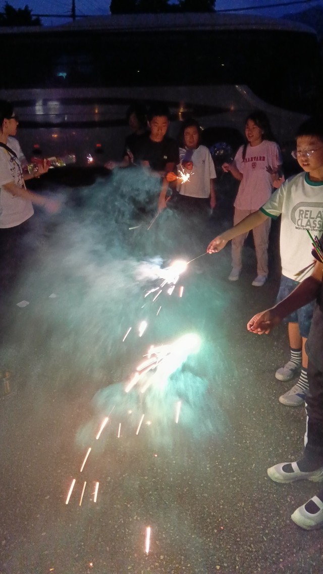 やっと暗くなりました。花火が始まりました。子どもたち一人ひとり手持ち花火を持ち、火を付けます。子どもたちの手元で花火が光っています。