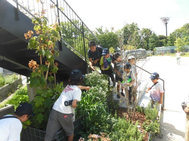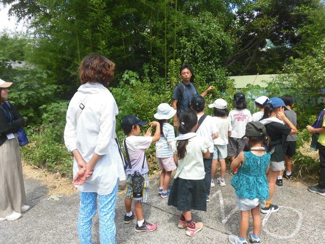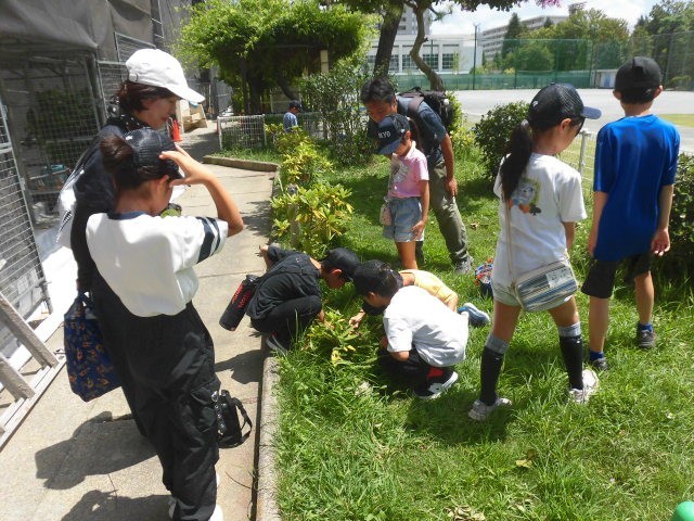 池尻小学校の敷地の中やホームワークビレジの敷地を散策しながら、虫についての話をしてくださっています。途中たくさんの虫を見つけ、虫かごに入れている人もいました。子どもたちは、虫についてのたくさんのお話を聞いてとてもうれしそうです。