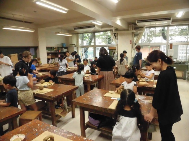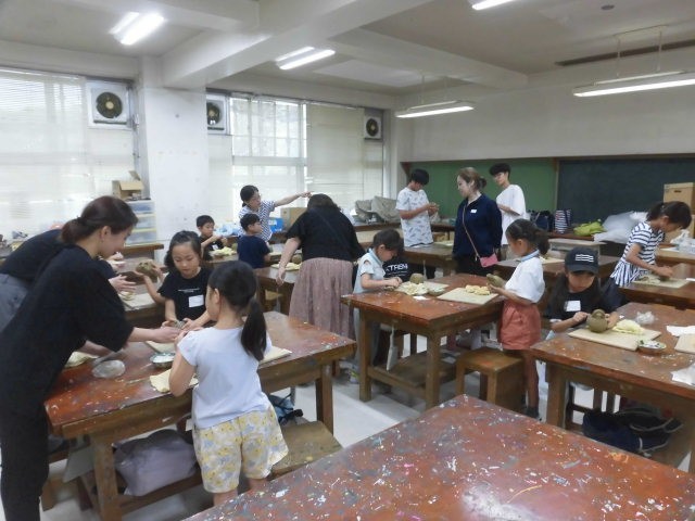 焼き物の講座です。新聞紙を芯にして鈴を作ります。音が鳴るよう新聞紙には粘土の玉が入れたあります。子どもたちがつくる鈴にはいろいろな形がありますが、きれいな丸を意識している人が多くいます。子どもたちは、穴の開け方や持ち手の付け方を工夫しています。