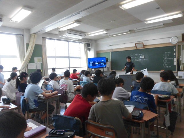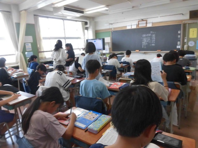5年生の教室では、新しい教科書に名前を書いたり、夏休みの思い出の話などをしていました。どちらの教室も先生が話を始めると、子どもたちはやっていることをやめて話を聞きはじめます。しっかりとした態度の5年生です。