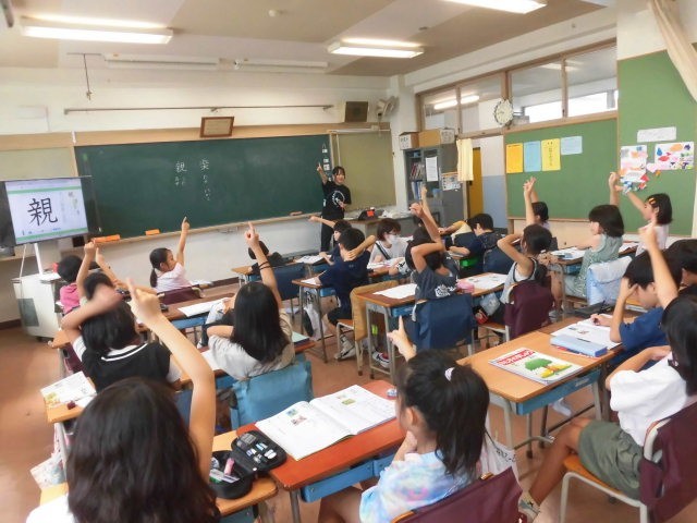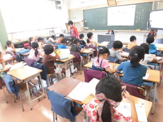 2年生の教室では国語の漢字の学習をしていました。一つのクラスでは教科書を使って、もう一つのクラスは漢字ドリルを使って学習をしていました。子どもたちは、一文字一文字しっかりと鉛筆を動かし漢字を書いていました。