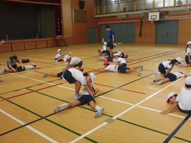 4年生の授業は体育です。体つくり運動の「力試しの運動」と「用具を操作する運動」の学習です。