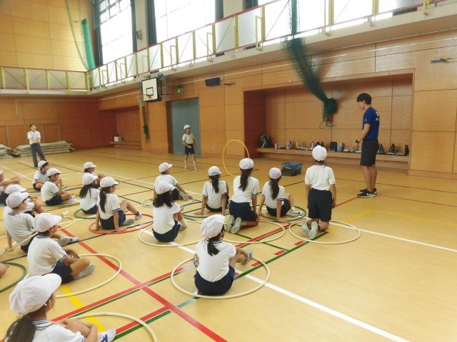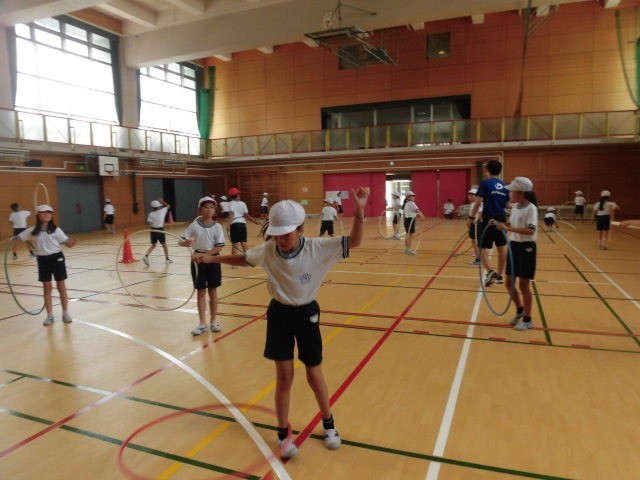 はじめは「力試しの運動」です。引き相撲や俵返し、ロープ引きをしました。子どもたちはどのようにしたら思い切り力を出すことができるのかを考えています。そのあとは、フラフープを回したり転がしたりする運動です。子どもたちはフラフープを腰できれいに回しています。わたしもやってみましたがうまく回りません。子どもたちに教えてもらいながらやってみましたが、うまくいきません。「校長先生、動き方が変だよ。」子どもたちに言われてしまいました。頑張ります。