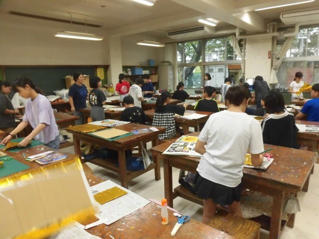 段ボールに大きな金色の紙を貼り、その上に植物や動物などの生き物を描いていきます。どのような仕上がりになるのでしょう。出来上がる作品が楽しみです。