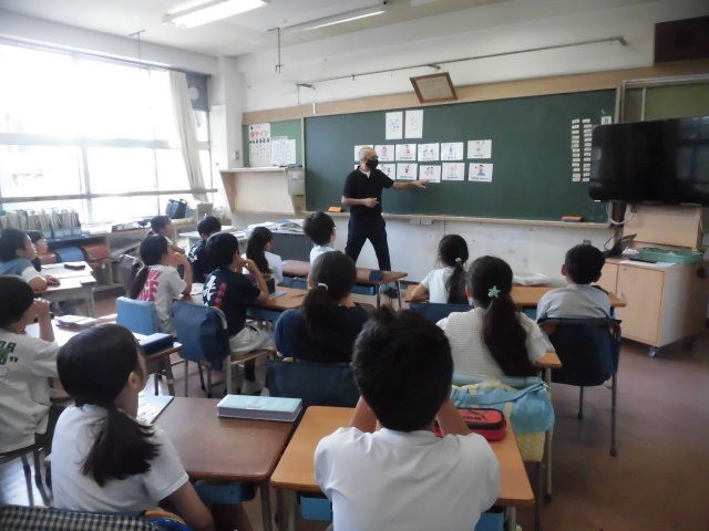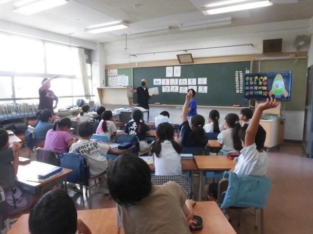 3年生の授業は外国語です。ALTの先生と一緒の授業です。スポーツの話をしています。子どもたちが前に出て、自分の好きなスポーツの説明をしています。みんな笑顔で外国語の学習をしています。