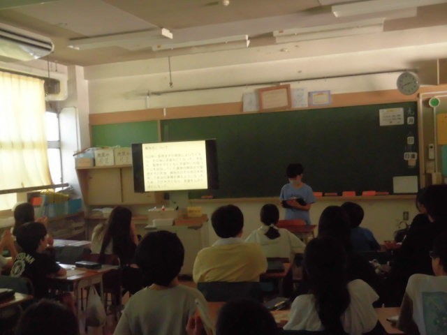 発表方法は各自自分たちで考えています。プレゼンテーションソフトを使う人、紙芝居の人などいろいろあります。発表をすることで、自分たちの理解が深まっていることが見ていて伝わってきました。