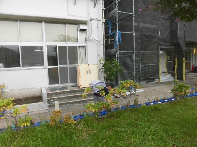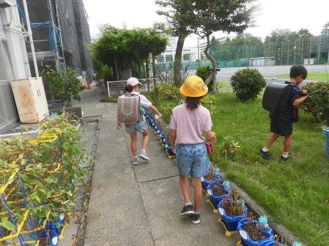 1年生2年生は自分が育てている植物に水をあげています。暑い日が続いていて、植物も水を欲しがっているでしょう。