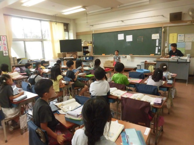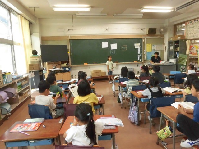 1年生の授業は国語です。夏休みの思い出をみんなの前で発表する授業です。