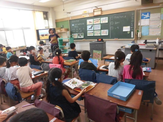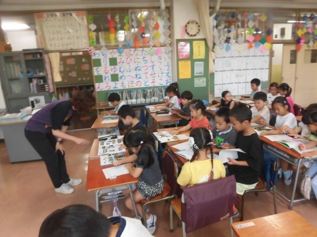 1年生の授業は図工です。「どうぶつランド」と題して、自分の好きな動物を題材にして絵を描きます。