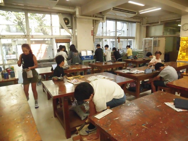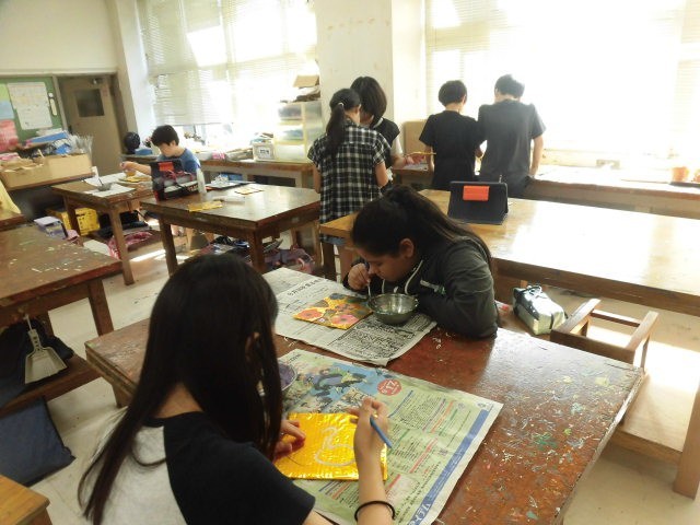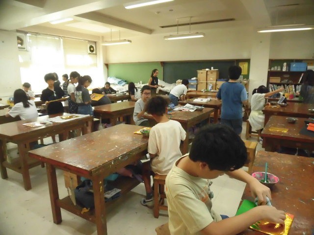 5年生の授業は図工です。金の紙を貼った台紙に絵を描いています。絵の具を混ぜ、自分で色をつくっています。台紙は金でみんな同じなのですが、出来上がっていく作品の雰囲気は一人ひとり全く違います。