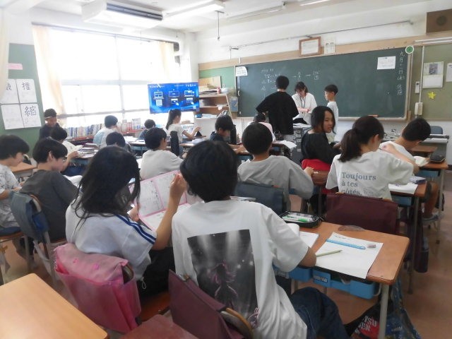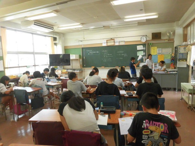 6年生の授業は算数です。拡大図と縮図の学習です。一人ひとりが問題を解いて、先生に見てもらっています。わたしは小学生の時、この拡大図と縮図の学習がとても苦手だったことを覚えています。子どもたちには頑張ってほしいです。