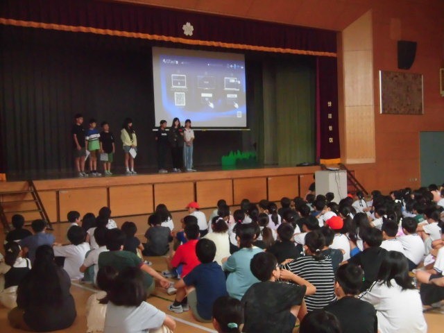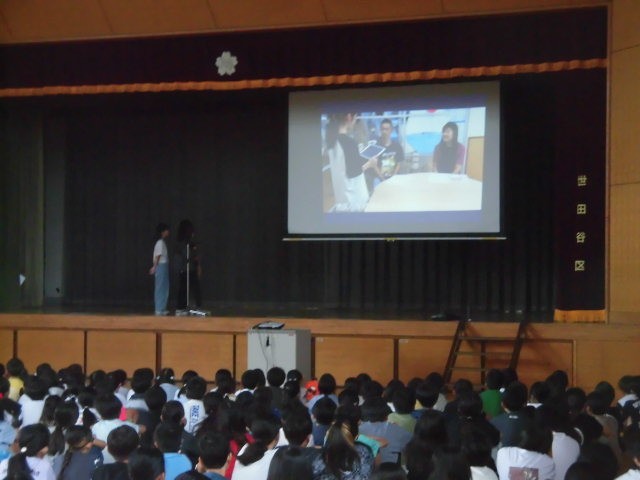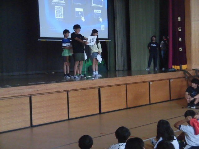 周年委員会の人たちが、池尻小学校の近隣の施設の方や卒業生などにインタビューをしたビデオを流しました。新BOPの先生、児童館の先生、そして池尻小学校の第1回の卒業生の方からお祝いのメッセージをもらいました。その方々からは、池尻小学校の子どもたちを漢字一文字で表すと何の漢字になるかを教えてもらいました。